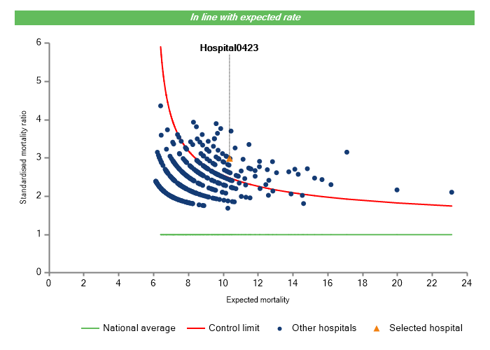 This hospital is represented on the chart by the black marker (). Please click on the “How to interpret this chart” button for further information.