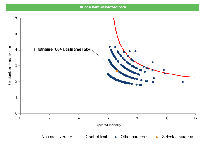 The vertical axis figures are presented as a standardised mortality ratio. This means the values do not represent percentages of patients who have died, but they represent the proportion of deaths compared to the national average. The data is also risk adjusted to take account of the fact that different surgeons may operate on more higher-risk or lower-risk patients e.g. because of demographics in the patient population they work with.