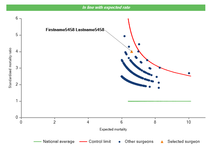 The vertical axis figures are presented as a standardised mortality ratio. This means the values do not represent percentages of patients who have died, but they represent the proportion of deaths compared to the national average. The data is also risk adjusted to take account of the fact that different surgeons may operate on more higher-risk or lower-risk patients e.g. because of demographics in the patient population they work with.