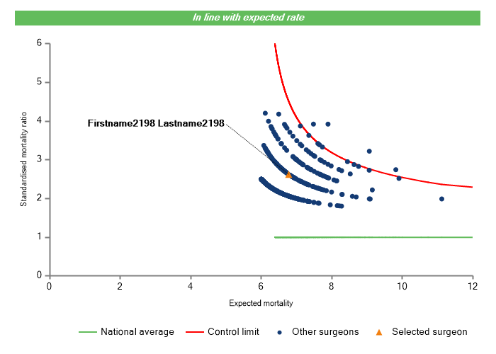 The vertical axis figures are presented as a standardised mortality ratio. This means the values do not represent percentages of patients who have died, but they represent the proportion of deaths compared to the national average. The data is also risk adjusted to take account of the fact that different surgeons may operate on more higher-risk or lower-risk patients e.g. because of demographics in the patient population they work with.