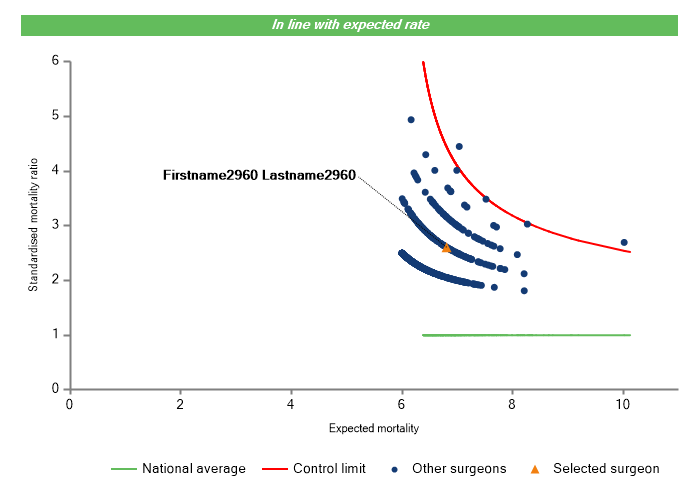 The vertical axis figures are presented as a standardised mortality ratio. This means the values do not represent percentages of patients who have died, but they represent the proportion of deaths compared to the national average. The data is also risk adjusted to take account of the fact that different surgeons may operate on more higher-risk or lower-risk patients e.g. because of demographics in the patient population they work with.