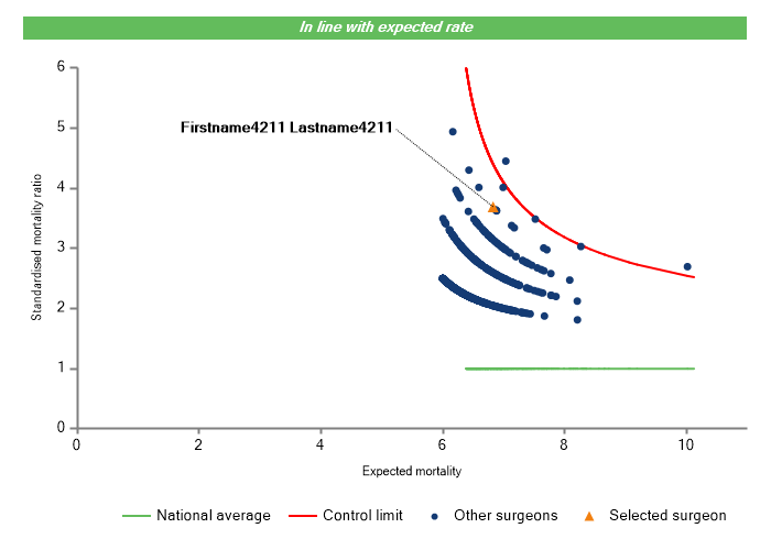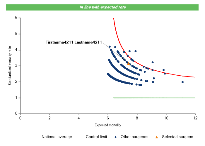 The vertical axis figures are presented as a standardised mortality ratio. This means the values do not represent percentages of patients who have died, but they represent the proportion of deaths compared to the national average. The data is also risk adjusted to take account of the fact that different surgeons may operate on more higher-risk or lower-risk patients e.g. because of demographics in the patient population they work with.