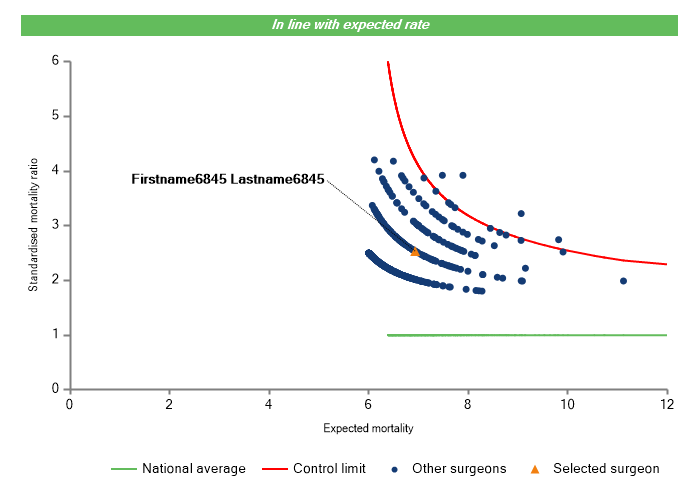 The vertical axis figures are presented as a standardised mortality ratio. This means the values do not represent percentages of patients who have died, but they represent the proportion of deaths compared to the national average. The data is also risk adjusted to take account of the fact that different surgeons may operate on more higher-risk or lower-risk patients e.g. because of demographics in the patient population they work with.