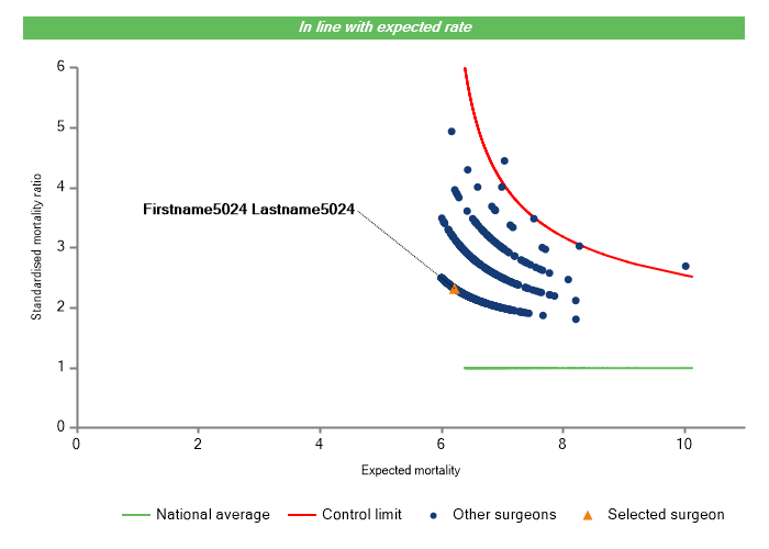 The vertical axis figures are presented as a standardised mortality ratio. This means the values do not represent percentages of patients who have died, but they represent the proportion of deaths compared to the national average. The data is also risk adjusted to take account of the fact that different surgeons may operate on more higher-risk or lower-risk patients e.g. because of demographics in the patient population they work with.